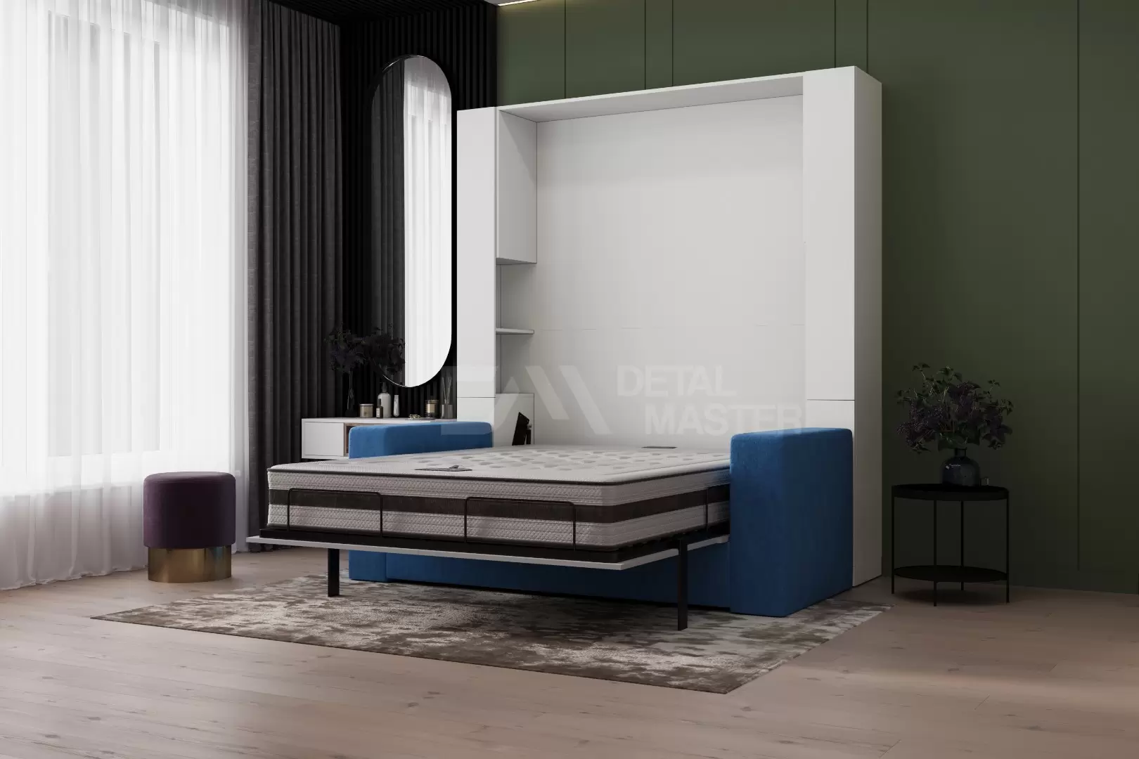 Шкаф-кровать трансформер с диваном " Nova Comfort Balance 2.0." работает на механизме раскладывания собственной разработки "Balance". Кровать раскладывается легким движением руки, превращаясь в полноценное спальное место. Просто потяните за ножку-маятник, которая самостоятельно фиксируется в нужное положение при опускании.
